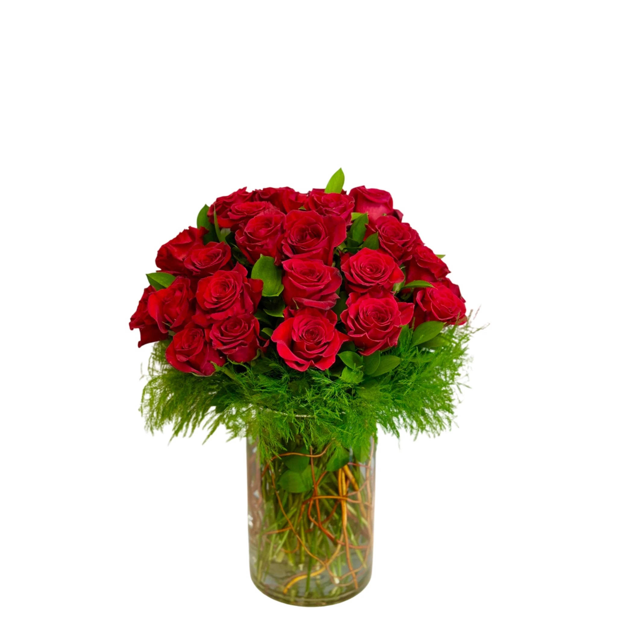 Sure to impress, this striking arrangement fills a large cylinder vase with 36 stems of densely packed red roses plus tree fern and curly willow. 23”H x 20”W