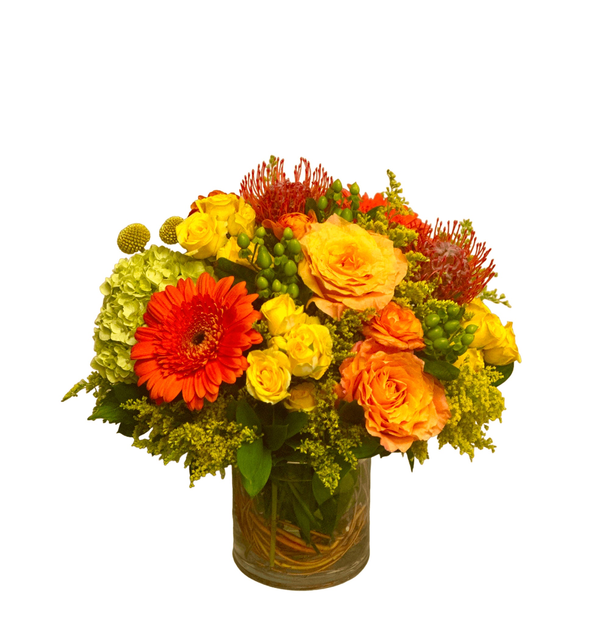 An arrangement with free spirit roses, pin cushion protea, ranunculus, spray roses, mojito hydrangea and craspedia, in a tapered clear glass vase. 15”W X 14”H