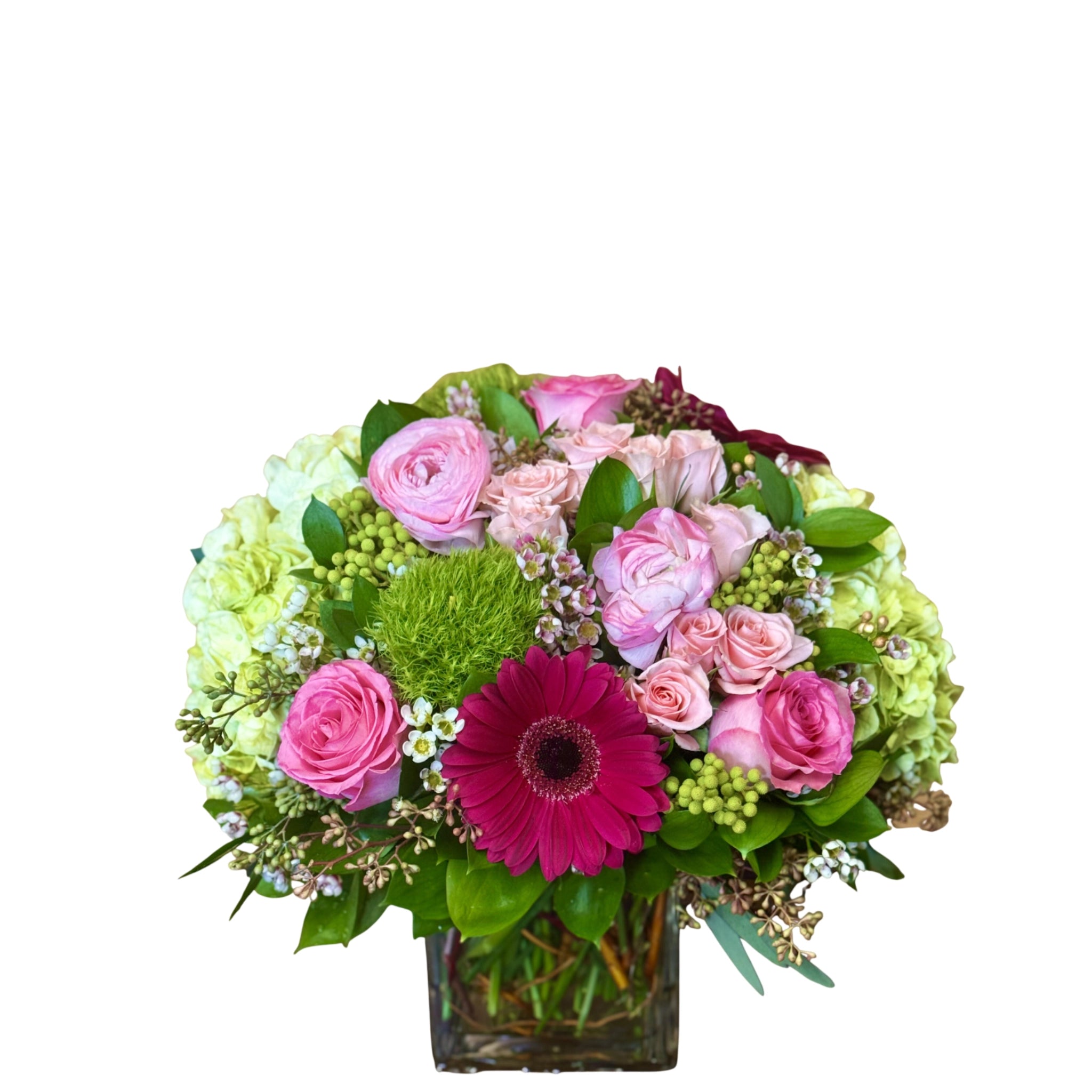 An uplifting arrangement of springtime beauty. Pink ranunculus, peach spray roses, pink sweet unique roses, green trick, hot pink gerberas, berzelia berries and mojito hydrangea are artfully arranged in a clear glass vase. 14”H X 14”W.