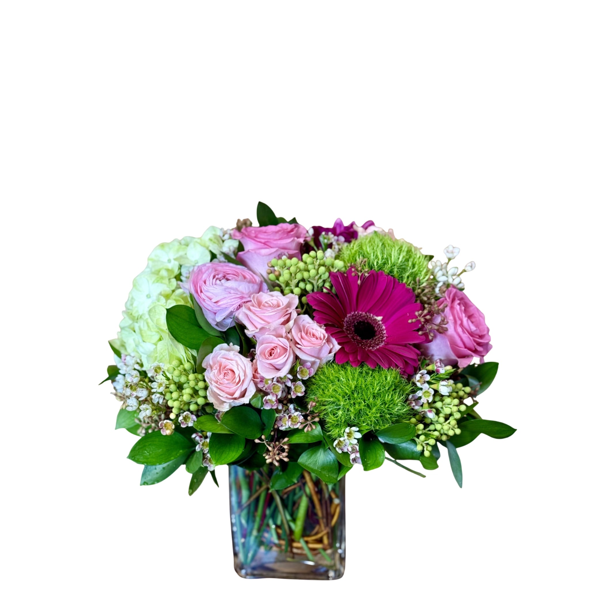 An uplifting arrangement of springtime beauty. Pink ranunculus, peach spray roses, pink sweet unique roses, green trick, hot pink gerberas, berzelia berries and mojito hydrangea are artfully arranged in a clear glass vase. 12”H x 12”W.