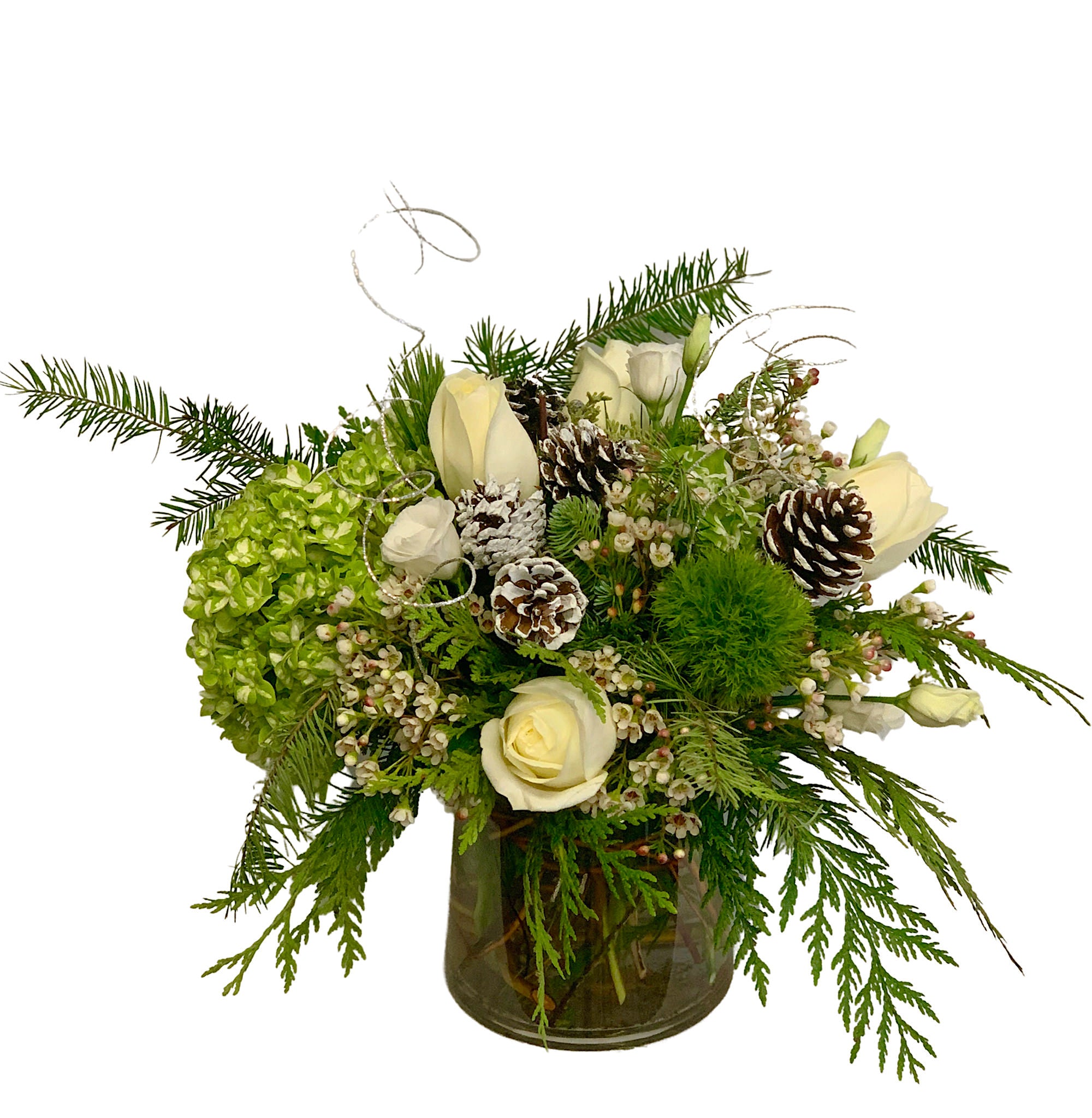 White and green arrangement with roses, hydrangea, lisianthus, holiday greens, frosted pine cones and silver ting ting.