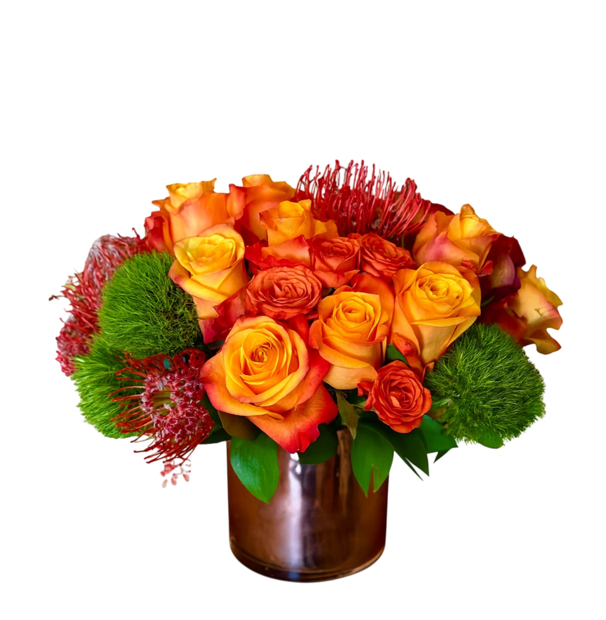 A radiant display of autumn warmth. Vibrant orange and golden yellow roses take center stage, accented with fiery red pincushion protea and lush green trick dianthus. Arranged in a sleek copper container, this design will brighten any space. 12”H x 15”W