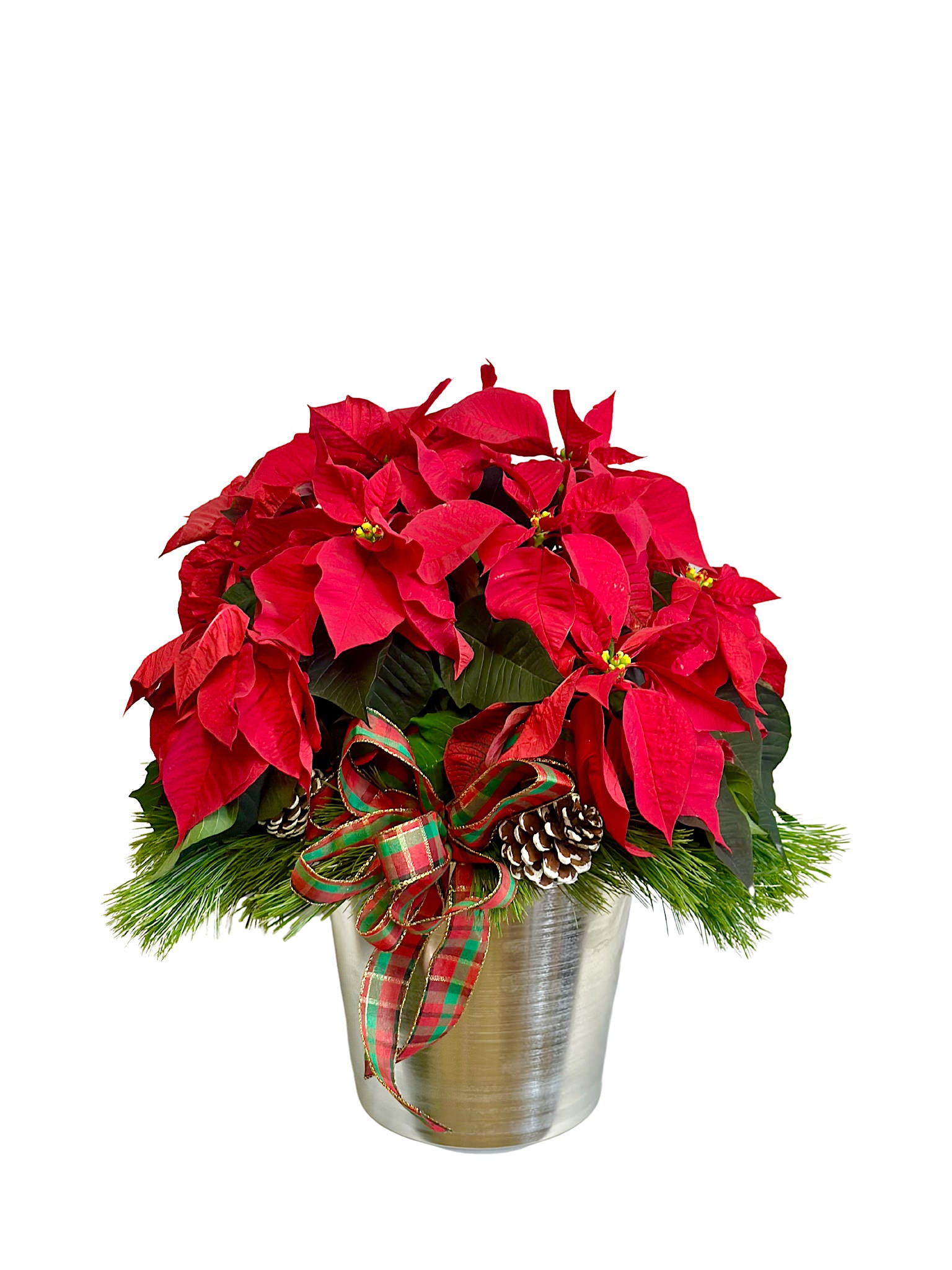 A double-branch red poinsettia plant in a silver container with a bow, holiday greens, and frosted pine cones. Measures about 27-inches tall and 24-inches wide.
